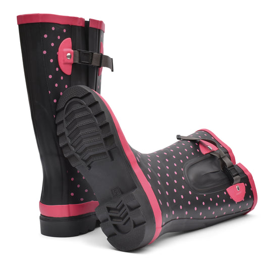 Pink Polka Dots on Black Tall Wide-Calf Wellies – Slimmer Fit Through the Foot